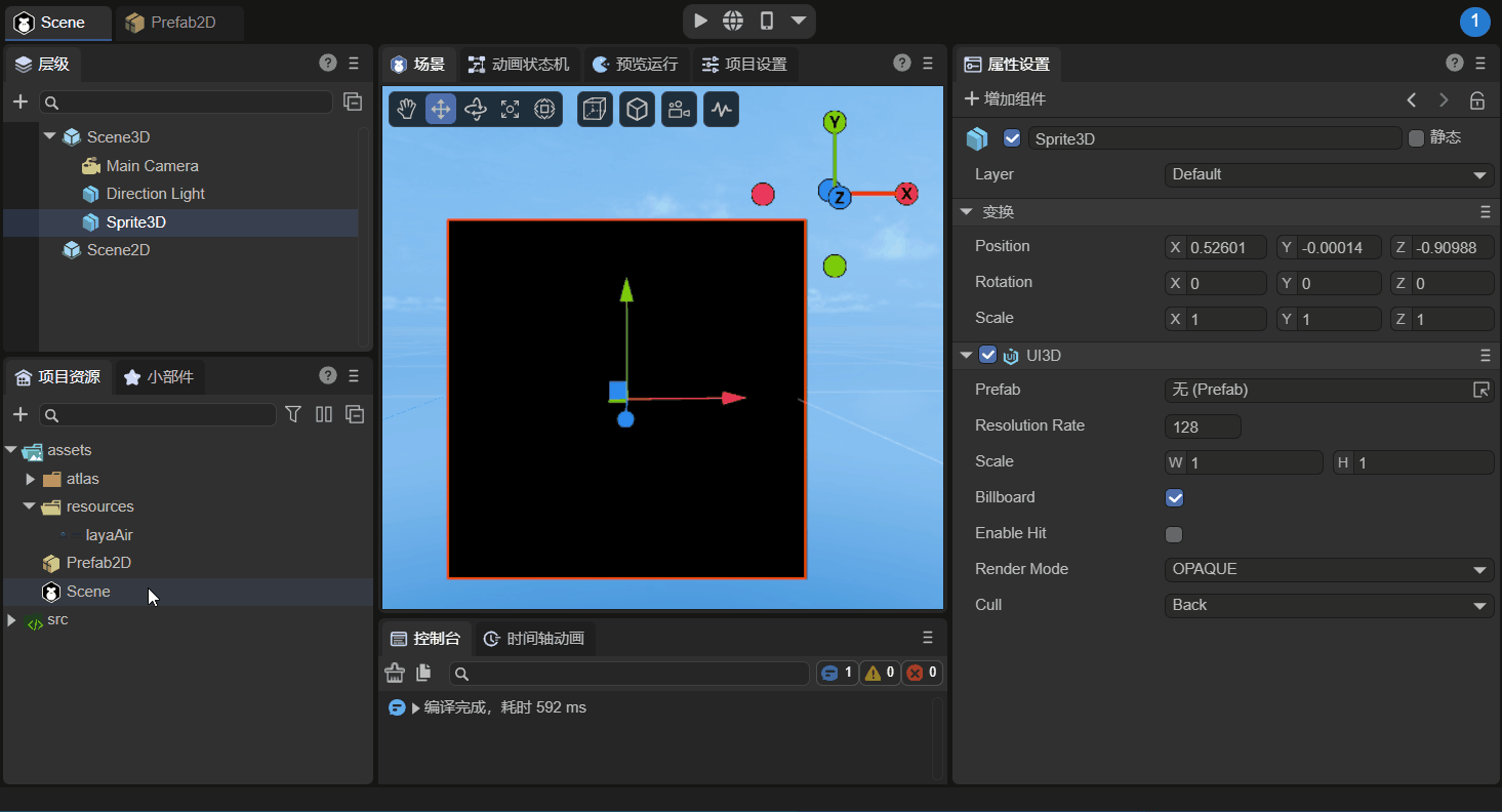 在IDE的Scene3D节点下,创建一个Sprite3D对象,添加UI3D组件,如动图2-2所示。