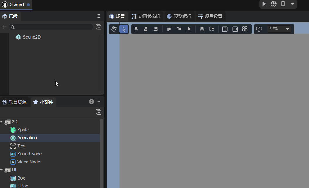 You can also drag an Animation node directly from the Widget panel into the Scene Editor or Hierarchy panel, as shown in Animation 2-2.