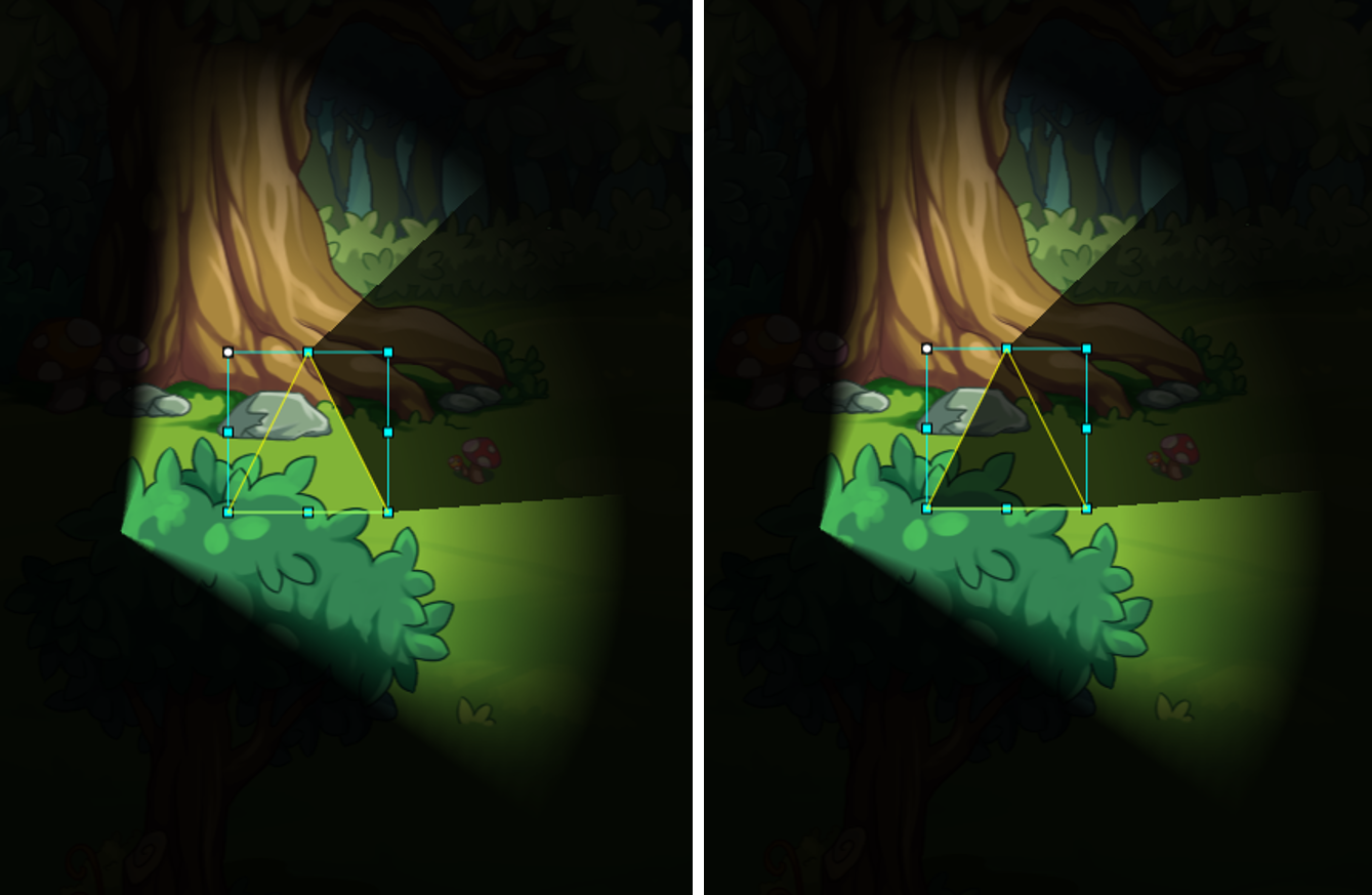 Internal Occlusion: Whether to generate occlusion effects when the light source is inside the light occluder. After checking, the light source will also generate occlusion when it is inside the light occluder, as shown in Figure 2-4 (left); if not checked, the light source will not generate shading effect when it is inside the light occluder, as shown in Figure 2-4 (right). (In Figure 2-4, the small square is 2D Freeform Light, and the large triangle is 2D Light Occluder)