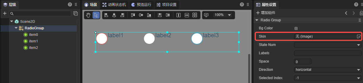 In the previous section, the same radio button resource was used, and three radio button boxes were generated by setting labels in RadioGroup. However, in actual games, there are different requirements for radio button styles in the same RadioGroup component, so this requirement cannot be fulfilled by setting labels. At this time, you need to use a custom RadioGroup component. Here are the specific steps: